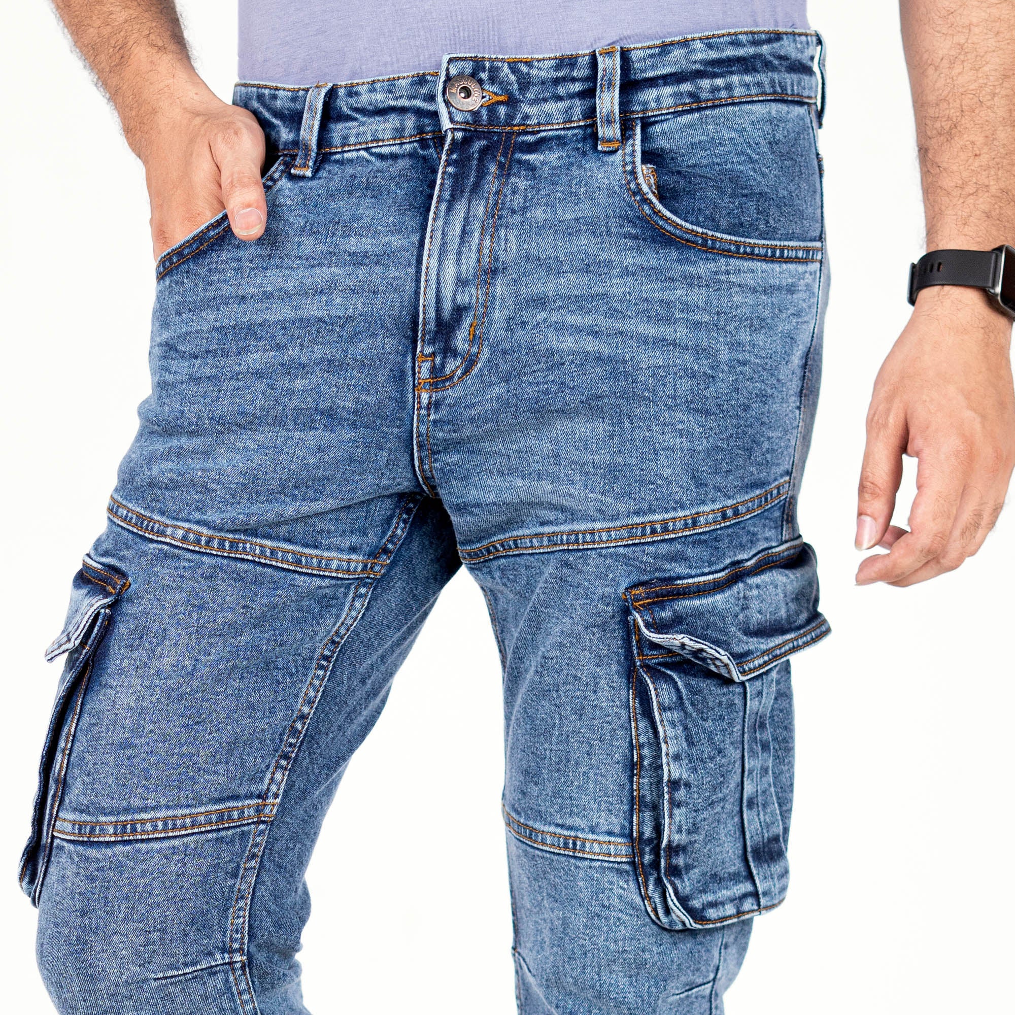 Premium Denim Cargo Pants - Bleach Wash Mid Blue